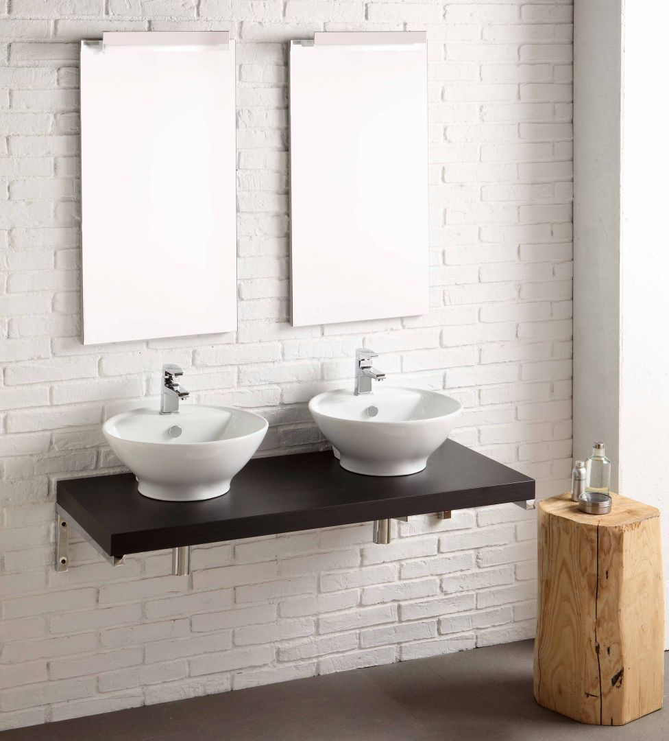 meubles de salle de bain de composition qui comprend de dessus de table avec une hauteur de 10 cm de finition chêne foncé, en supports métalliques de chrome avec des vis de montage, évier double en céramique modèle Momart, double miroir de 45x90 cm et d'une lampe d'éclairage avec économie d'énergie. Ce projet a été conçu pour une simple et mis à jour dans la conception de salle de bains. Composition Made in Italy