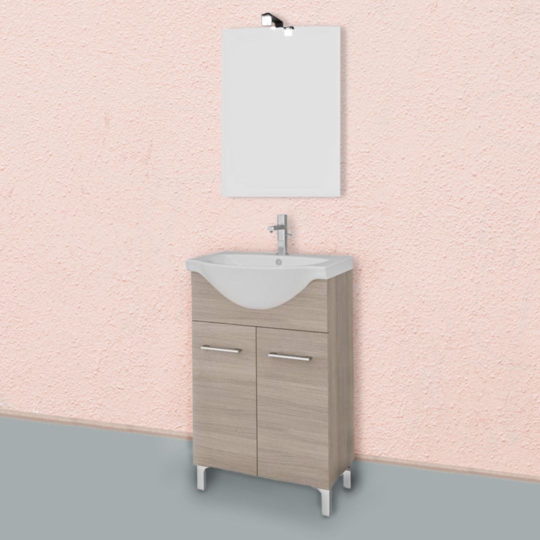 MEUBLE DE SALLE DE BAINS SUR PIED 55CM 2 PORTES CHÊNE GRIS, LAVABO ET MIROIR | RIMINI182,90 € 22% TVA incluse -